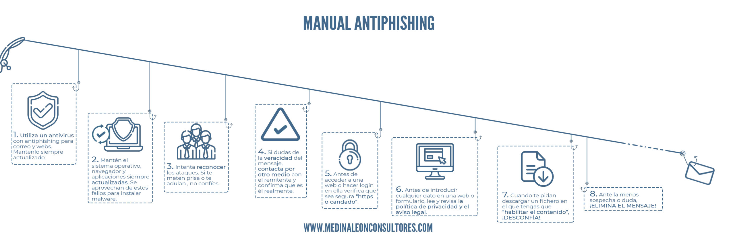 La semana pasada os hablamos del PHISHING, lo que era y las posibles ciberestafas que se podían estar produciendo. Es por ello que desde MedinaLeon Consultores queríamos elaborar un manual ANTIPHISHING para ayudar a detectar y prevenir posibles ciberataques. Son medidas que se pueden extrapolar a otros tipos de ciberdelitos y algunas de ellas las hemos ido comentando en post anteriores.